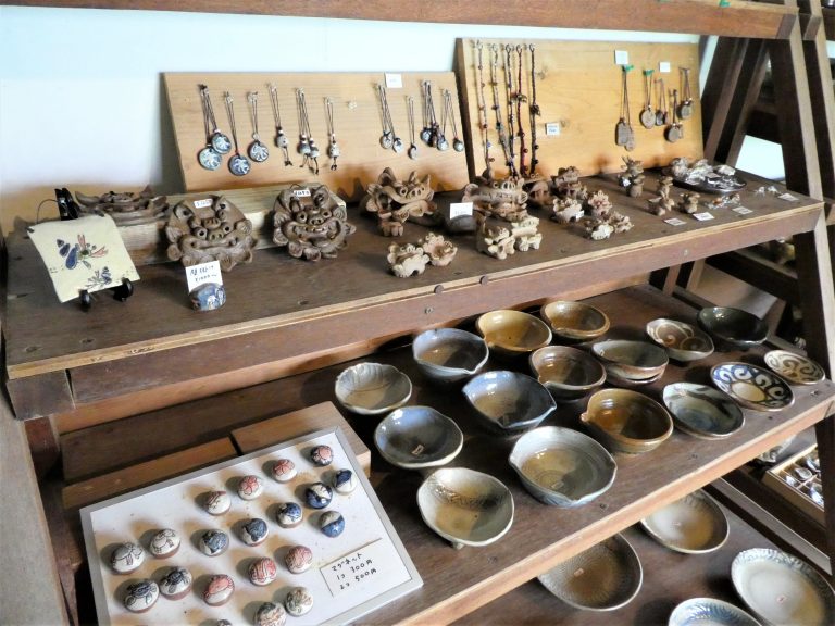 店内には沖縄定番のシーサーやちむんから、小皿、小鉢、コップ