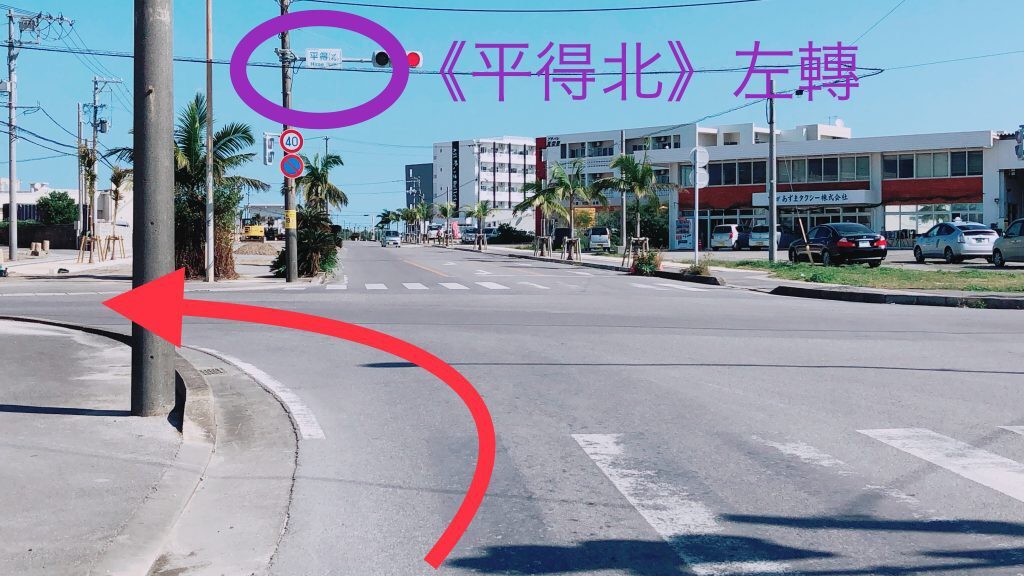 在平得路口右轉後直騎,遇到第一個紅綠燈,在 「平得北 」 路口左轉。右前方會看到一間「あずまタクシー株式會社」。